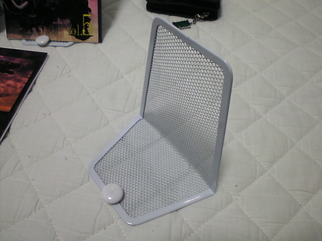 「ちなみに、青サバ用のスタンドのからくり。普通の金属製ブックエンドにマグネットを貼り付けてストッパーにしてある」